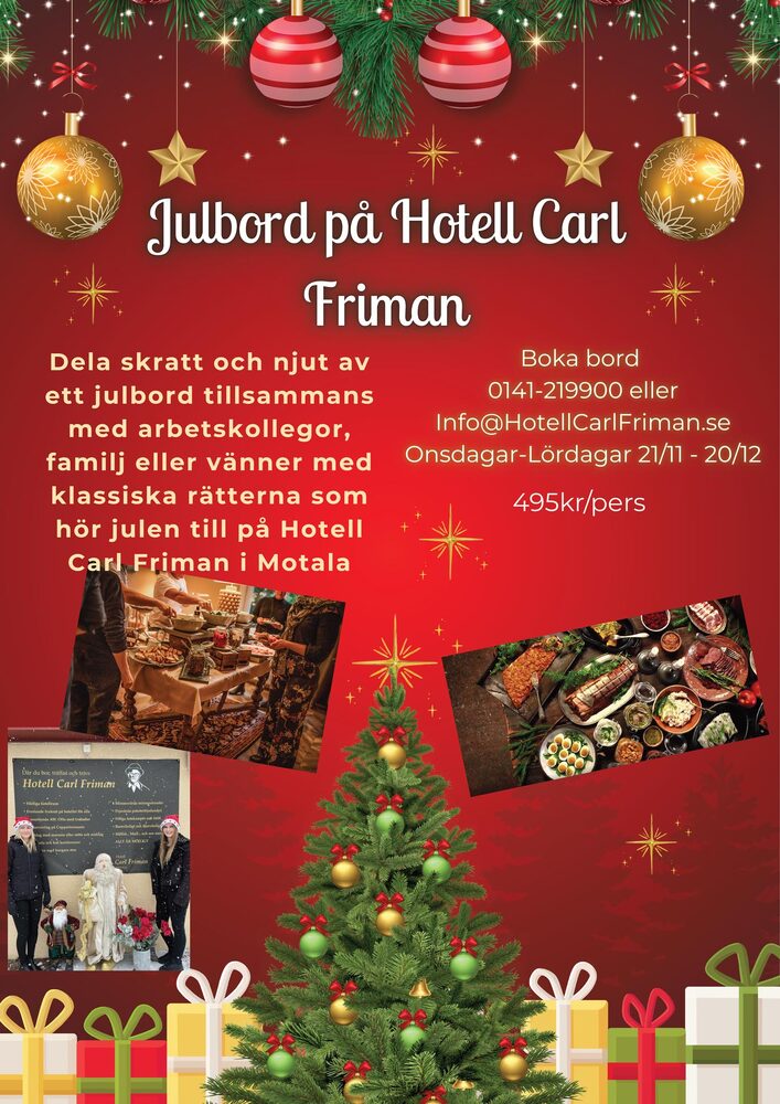 Oavsett om ni är kollegor, vänner eller familj, så är ni varmt välkomna att dela årets julbord med oss på Hotell Carl Friman.